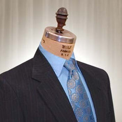 Fine wool suit in charcoal highlighted with a light gray pinstripe. Light blue oxford smoothly topped off with a gold-accent patterned tie.